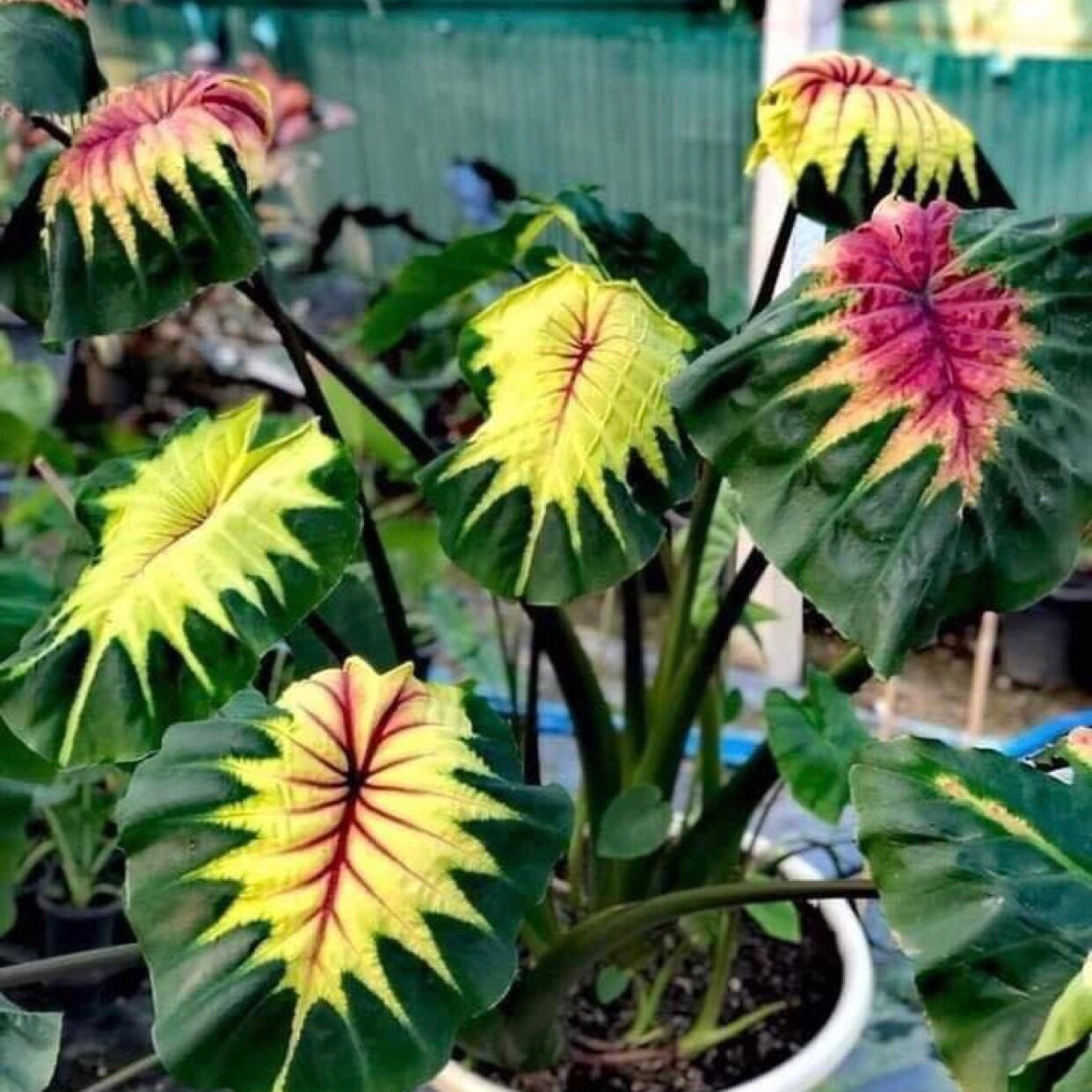 La colocasia, también conocida como máscara del faraón, es una variedad única con hojas brillantes que destacan. Además de las venas de las hojas que añaden profundidad. Los márgenes de las hojas son oscuros y se curvan hacia abajo. Esta planta puede alcanzar una altura de 4 pies y es más adecuada para contenedores grandes.