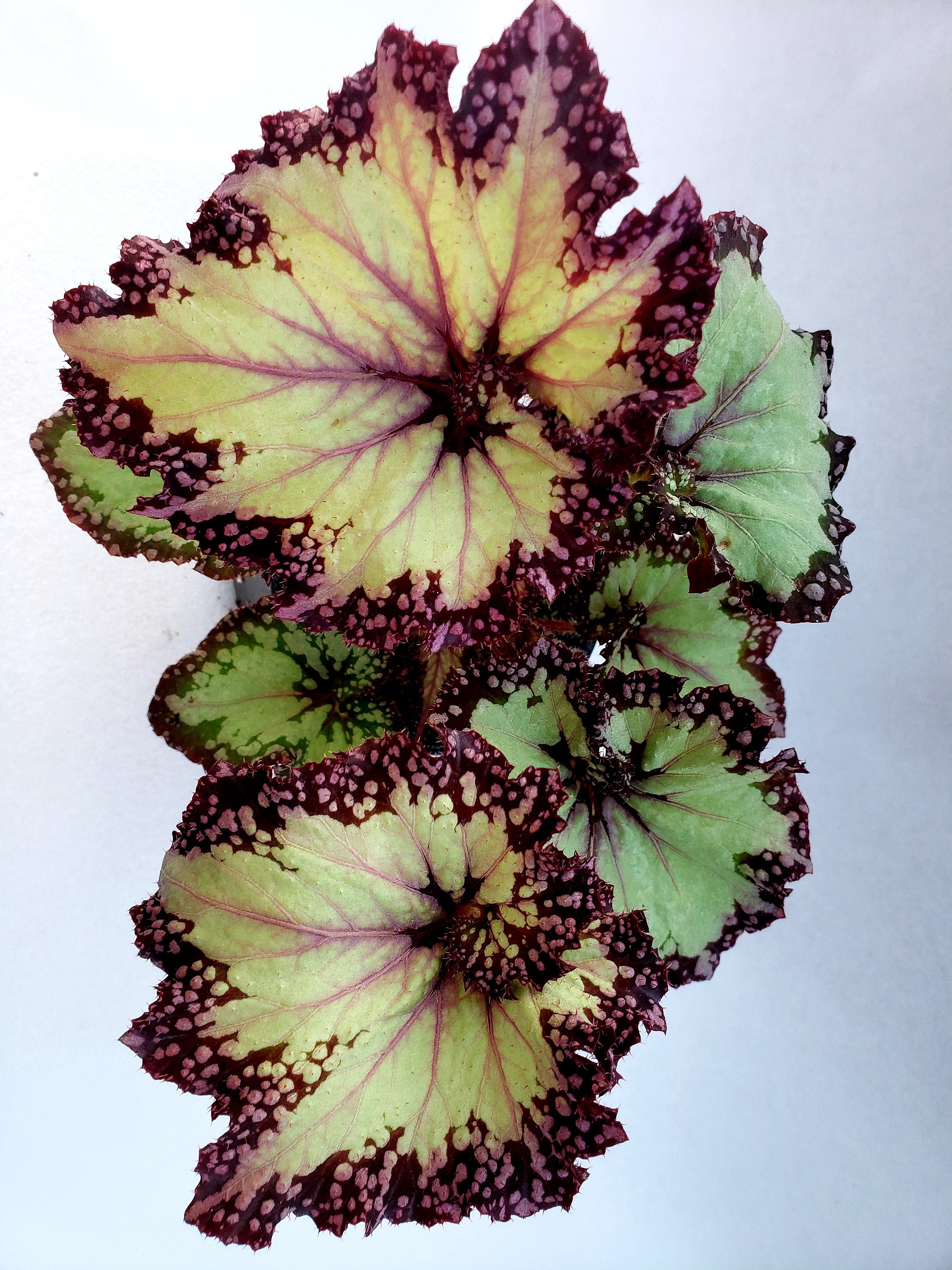 La begonia es una planta con hojas llamativas y un aspecto deslumbrante. Es una planta conocida por ser difícil de cuidar. Prospera en la sombra que todavía está expuesta a la luz del sol. Hojas plateadas con bordes verdes y detalles manchados.