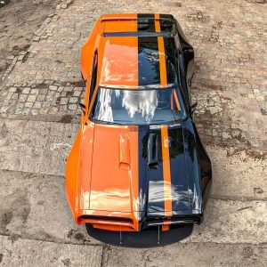 The gorgeous orange and black Pontiac GTO Mustang flexing its muscle